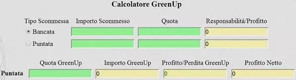 Se l’utente inizia l’operazione bancando una quota, si deve inserire nella casella bancata l’importo scommesso e la quota relativa. Nella casella sottostante di puntata quota green up si deve inserire la quota a cui intendiamo calcolare il green up. Se la quota bancata sarà inferiore a quella puntata, il calcolatore renderà un risultato positivo e avremmo realizzato il green up o tutto verde! Il calcolatore restituisce come risultato il Profitto lordo e il profitto netto (comprensivo delle commissioni pagate).